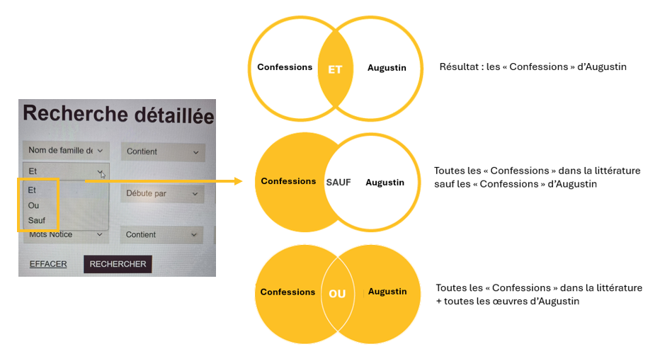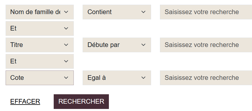 Elle peut être modulée par l'utilisation des expressions suivantes : "contient", "débute par" ou "égal à". Ainsi "contient", par exemple, est utile pour des recherches floues quand le titre exact n'est pas connu mais seulement un mot du titre.
